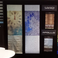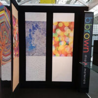 The 2017 bbrown Display Materials combined with Muraspec Wallcoverings for the first time this year, featuring at two events this year, The Retail Design Expo and The VM & Display show again. This year the design was stripped down to focus on specific Bbrown product ranges, namely the glitter fabrics, Organza and Rowlux. In addition to these materials the brief extended to introducing Muraspec products into the show for the first time with a digital wallcovering as feature wall, and several Bbrown digitally overprinted product drops. A large scale swatch of Disco and Jazz glitter samples looked bold and really caught the eye, and the over printing of the Muraspec logo onto a drop of glitter was also very striking. Muraspec introduced a bureau containing product samples and a display feature for wall coverings.