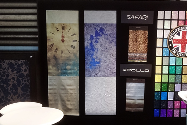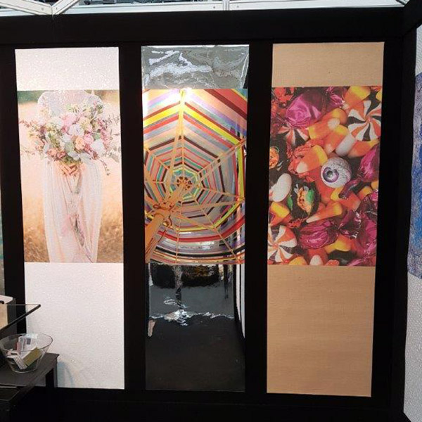 The 2017 bbrown Display Materials combined with Muraspec Wallcoverings for the first time this year, featuring at two events this year, The Retail Design Expo and The VM & Display show again. This year the design was stripped down to focus on specific Bbrown product ranges, namely the glitter fabrics, Organza and Rowlux. In addition to these materials the brief extended to introducing Muraspec products into the show for the first time with a digital wallcovering as feature wall, and several Bbrown digitally overprinted product drops. A large scale swatch of Disco and Jazz glitter samples looked bold and really caught the eye, and the over printing of the Muraspec logo onto a drop of glitter was also very striking. Muraspec introduced a bureau containing product samples and a display feature for wall coverings.