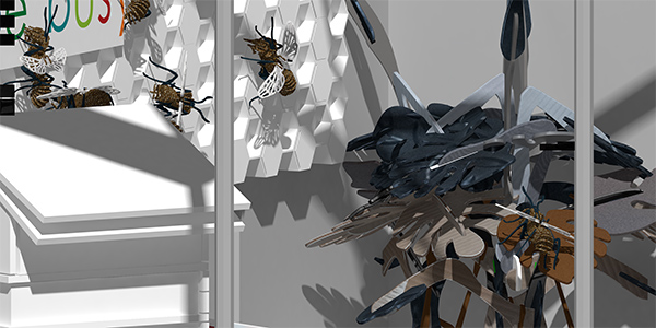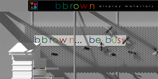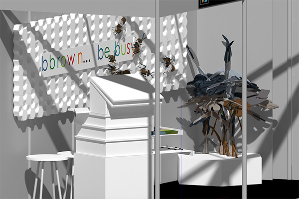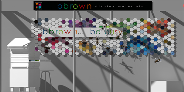 This was an initial response for a creative designer led brief that could bring together the very different product ranges and identities of two companies within the same group. It was a continuation of previous year's designs focus on the creative applications of products. The concept evolved around a slogan 'Bbrown...Be busy', a simple statement with a multitude of connotations. I wanted not only to involve as many sample swatches as possible on the cascading 'hex wall', but also to suggest sculptural application, cnc processing and make the whole impression dramatic, almost theatrical. The 'hive' housed sample books and 3d printed business card bees, and the giant slot-together plant in the corner was clad in metallic Muraspec vinyls, glitters and Rowlux producing a futuristic tech feel, and the bees became machine like in gold and black glitter.