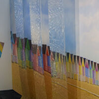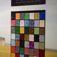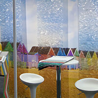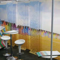 The 2019 bbrown/Muraspec exhibition stand only appeared at The VM & Display show. This time there was a departure from the series of printed drops on different substrates, instead using a large continuous print along the back wall, in front of which were hung several printed translucent drops of Rowlux. At certain angle the images matched up as the viewer moved across the stand, creating an eye catching effect, and emphasising bespoke design options from Muraspec's in house design and print facility. Further reference to the Muraspec bespoke print service was referred to in the colour manipulation of the Parquet wall covering texture that was colour matched to the beach hut image, and tilted to compliment the beach hut roofs.