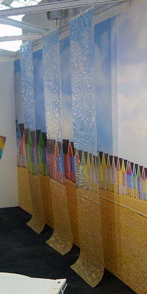 The 2019 bbrown/Muraspec exhibition stand only appeared at The VM & Display show. This time there was a departure from the series of printed drops on different substrates, instead using a large continuous print along the back wall, in front of which were hung several printed translucent drops of Rowlux. At certain angle the images matched up as the viewer moved across the stand, creating an eye catching effect, and emphasising bespoke design options from Muraspec's in house design and print facility. Further reference to the Muraspec bespoke print service was referred to in the colour manipulation of the Parquet wall covering texture that was colour matched to the beach hut image, and tilted to compliment the beach hut roofs.