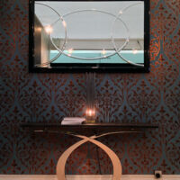 Fardis, originally a french high end interior wall coverings producer is central to the Muraspec group of companies, designing luxury products with a classical international style. Often metallics, eastern geometry and floral pattern combine into rich textures. This design was specifically for the Decorex International expo in West London, showcasing international interior and commercial design. The stand was supported by Decorus, providing all the furnishings. I created an Edwardian style simple fireplace, deep skirting boards and a choice of classic period wall coverings. The Impressions 3d routed panel was wall mounted between two mirrors to complete the design.