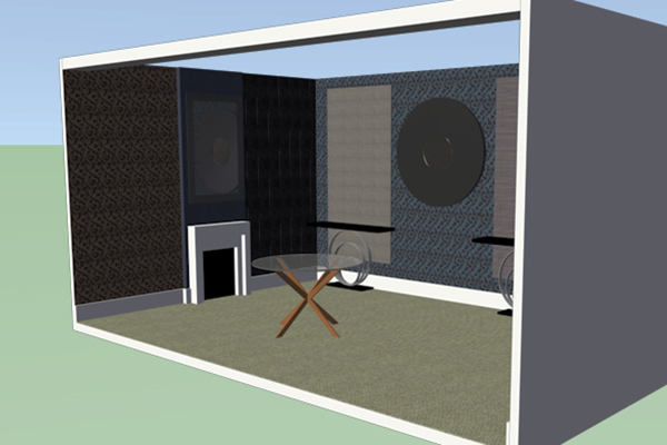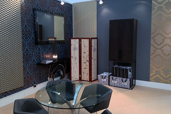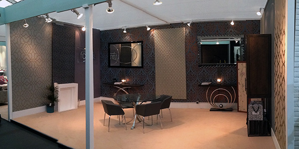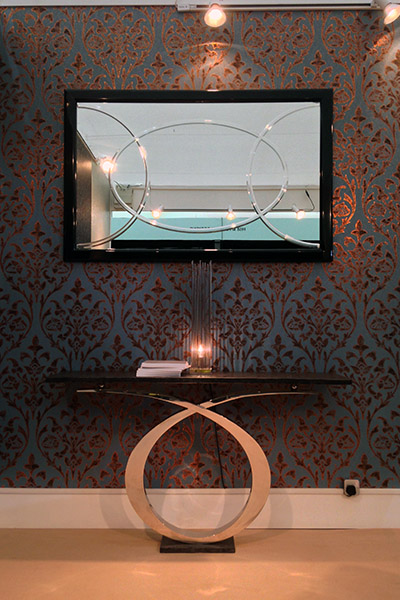 Fardis, originally a french high end interior wall coverings producer is central to the Muraspec group of companies, designing luxury products with a classical international style. Often metallics, eastern geometry and floral pattern combine into rich textures. This design was specifically for the Decorex International expo in West London, showcasing international interior and commercial design. The stand was supported by Decorus, providing all the furnishings. I created an Edwardian style simple fireplace, deep skirting boards and a choice of classic period wall coverings. The Impressions 3d routed panel was wall mounted between two mirrors to complete the design.
