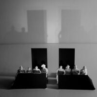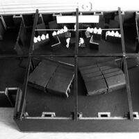 Angles became central to this design, not only in the limited space available in which to place the set, but also within the set itself. Weiss did not want any form of visual interpretation or reference to Auschwitz, so expression was limited to subtle abstractions. Shadows of character silhouettes were caught on walls behind the witnesses and defendants. The model box shows just how restrictive the space was. 120 people were accommodated, with the design pivoting around a central column.