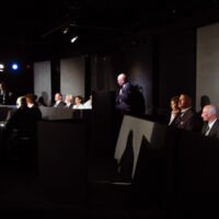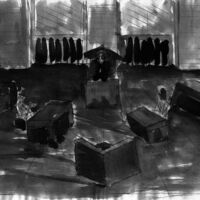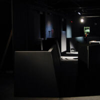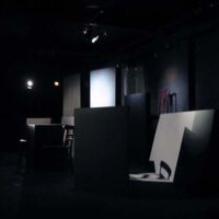The Investigation offered a serious challenge in that the author, Peter Weiss had stated that there should be little on stage to detract from the narrative of this oratorio. The performance space at The Arcola Theatre in North London was very restrictive as the performance required 19 characters to be visibly interact. Adding to the problem were several pillars in the space that could potentially loose seating capacity or force the set far away from the audience.