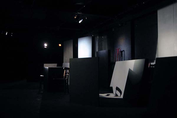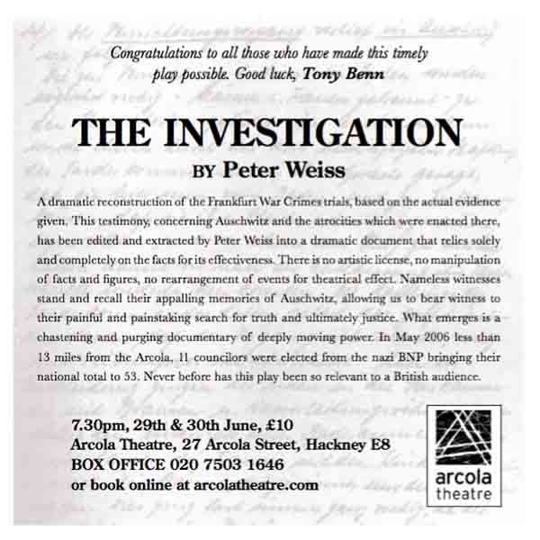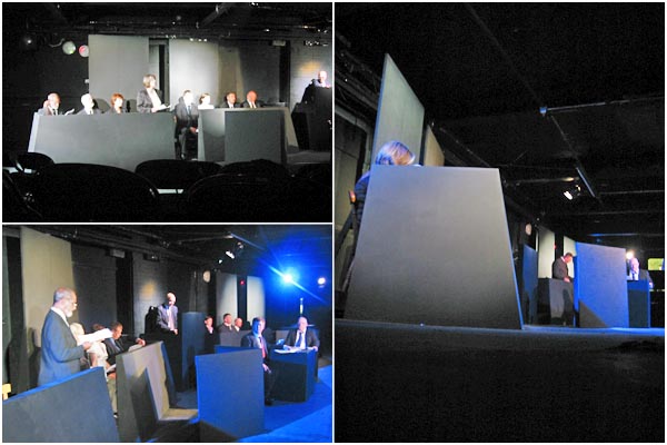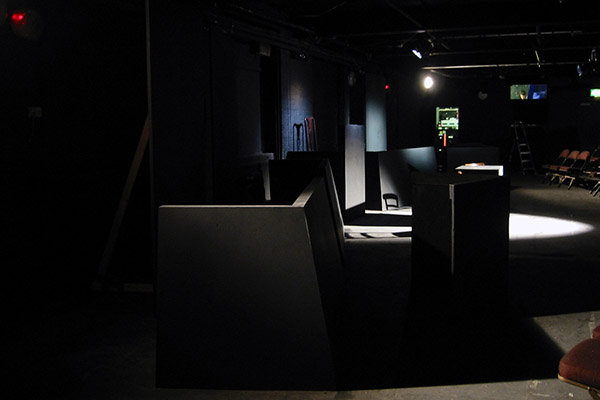The Investigation offered a serious challenge in that the author, Peter Weiss had stated that there should be little on stage to detract from the narrative of this oratorio. The performance space at The Arcola Theatre in North London was very restrictive as the performance required 19 characters to be visibly interact. Adding to the problem were several pillars in the space that could potentially loose seating capacity or force the set far away from the audience.