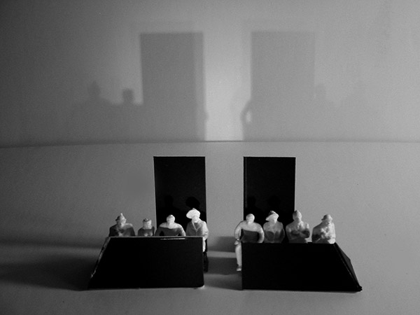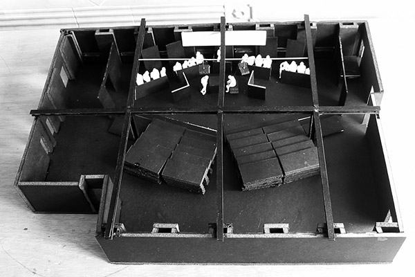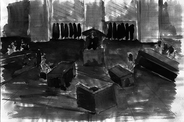 Angles became central to this design, not only in the limited space available in which to place the set, but also within the set itself. Weiss did not want any form of visual interpretation or reference to Auschwitz, so expression was limited to subtle abstractions. Shadows of character silhouettes were caught on walls behind the witnesses and defendants. The model box shows just how restrictive the space was. 120 people were accommodated, with the design pivoting around a central column.